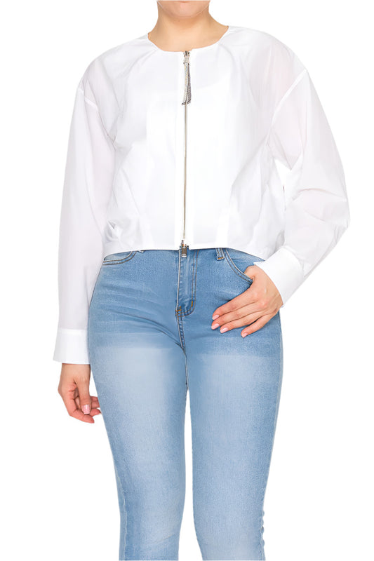 [Nabi] Minimalist White Zip-Up Cropped Blouse