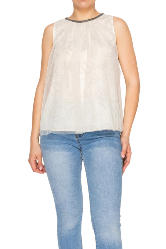 [Nabi] Elegant Sheer Sleeveless Floral Chiffon Blouse with Beaded Neckline