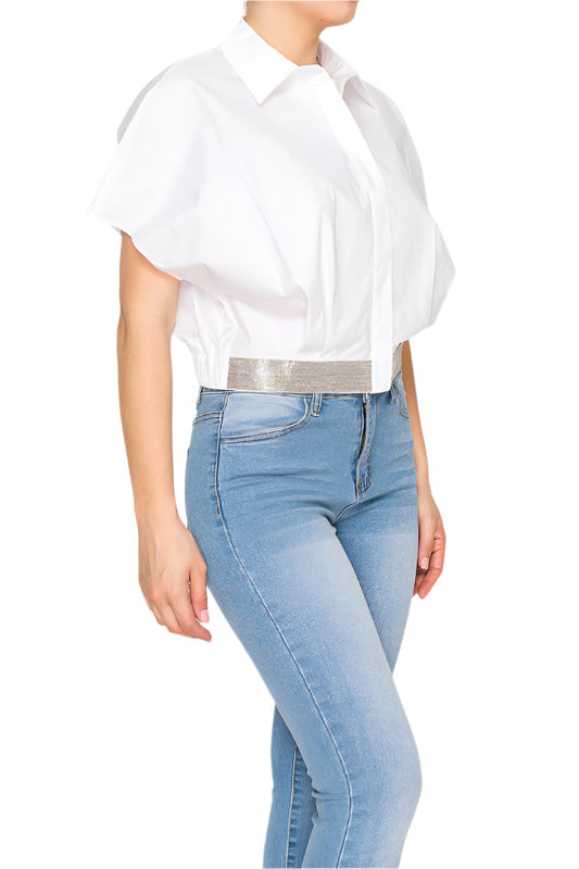 [Nabi] White Cropped Shirt with Metallic Waistband